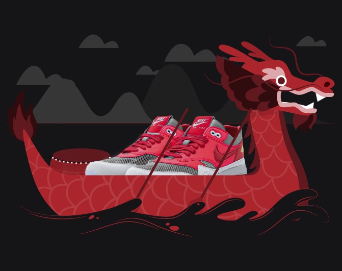 Well, finally, we’re breaking the boring rules and going into some serious drip! The upcoming Air Max 1 collab features a solar red and grey upper, giving the kicks a flashy vibe. But that’s not why we’re very excited about it. So back in 2006, Kanye West wore a pair of custom solar red CLOT Air Max 1 during his “Touch the Sky” tour. And we all know that everything Kanye West touches becomes a fashion statement!