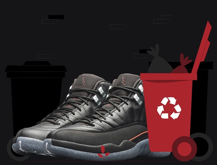 The upcoming black Jordan 12 Utility features an awesome black leather and nubuck upper with a dash of crimson. But the real action goes on in the midsole! It actually comes in a cool bluish gray grind material. Now, Nike Grind is a mix of recycled materials that come from old kicks, manufacturing materials, and more. So this pair has sustainability in mind!